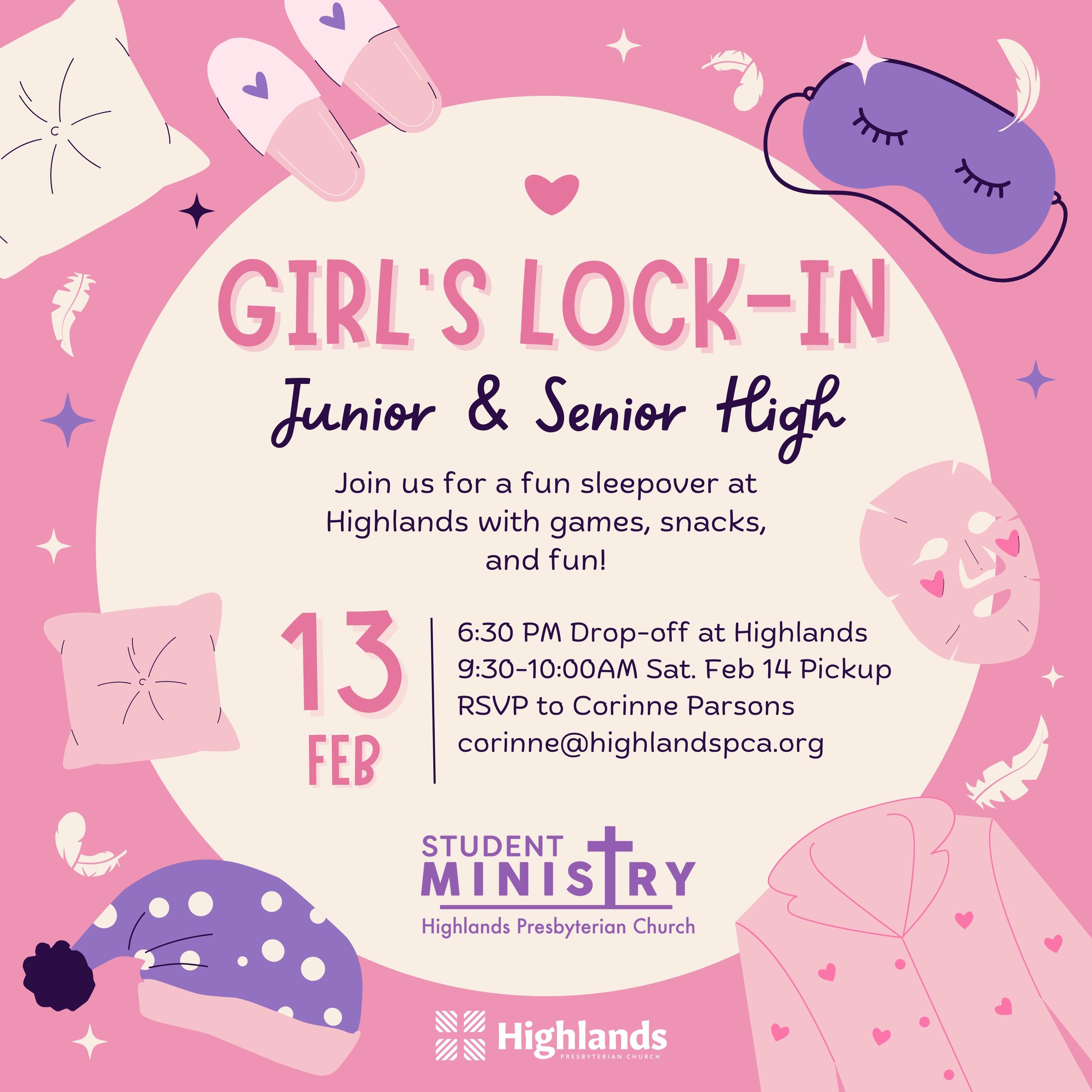 Friday, February 13 — Saturday, February 14: Junior and Senior High Girls’ Lock-In at Highlands.